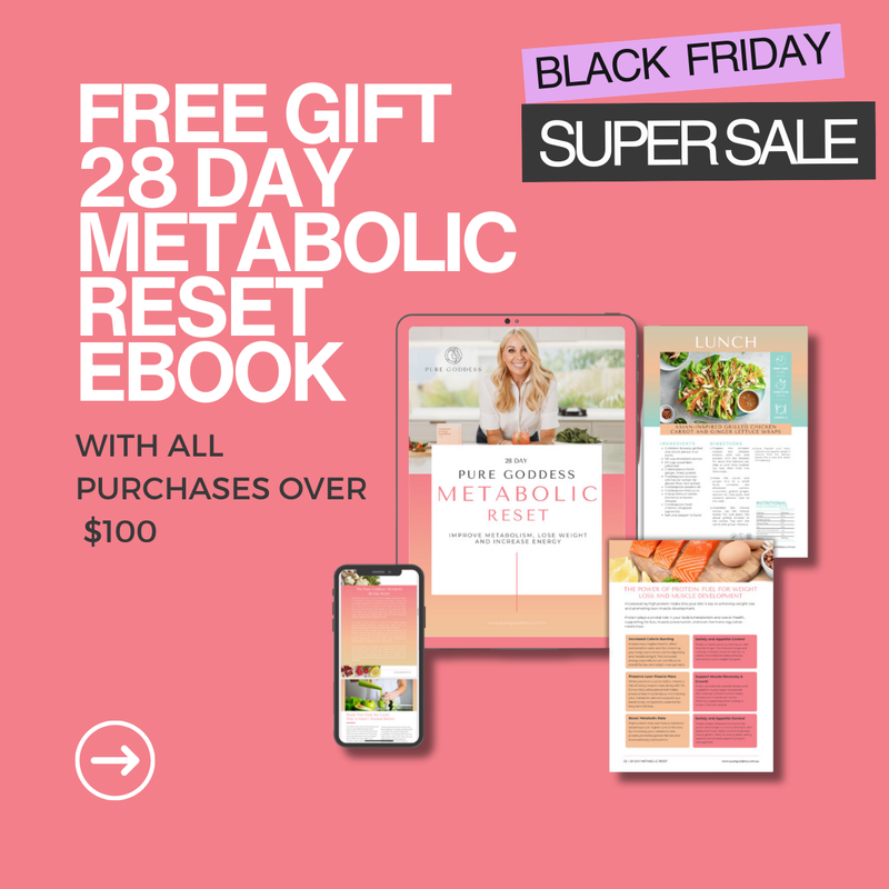 Get our best selling 28 Day Metabolic Reset Ebook valued at $29.99 with all orders over $100 - automatically adds to cart.