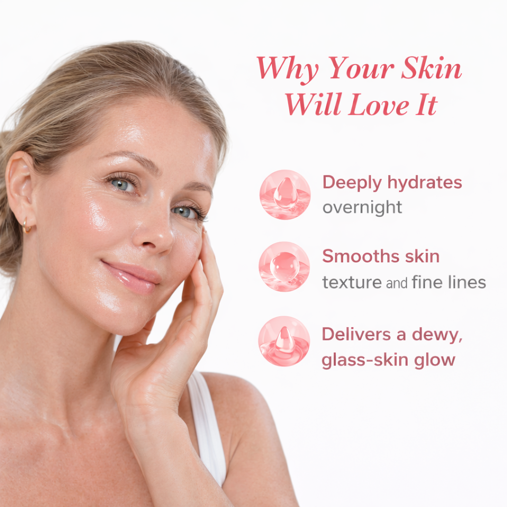 Your skin naturally repairs itself while you sleep, and this mask is designed to support that process. Instead of overloading the skin, it enhances hydration and elasticity exactly when your skin is most receptive.
